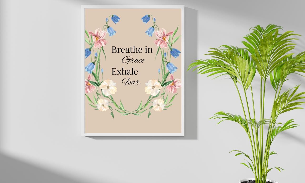 Choose "Breathe in Grace, Exhale Fear" for a calming bible verse, motivational quote, and uplifting scripture all in one beautiful design. Let this digital art inspire you to embrace peace, faith, and grace in every moment.