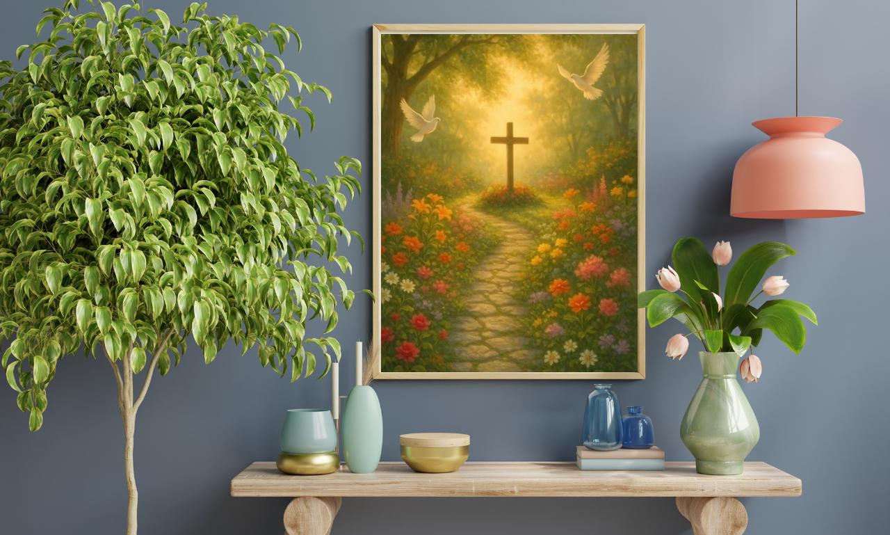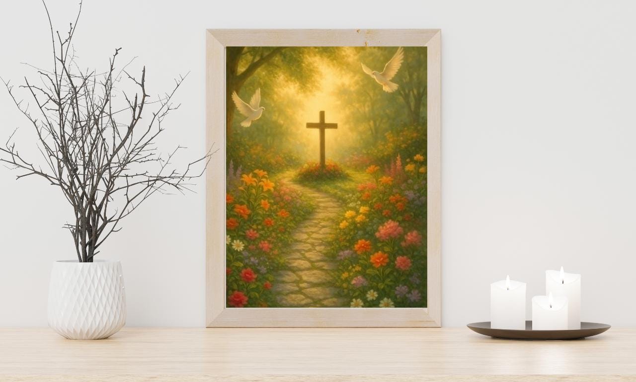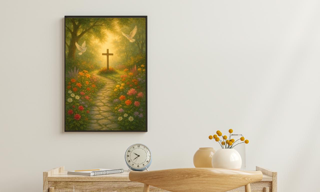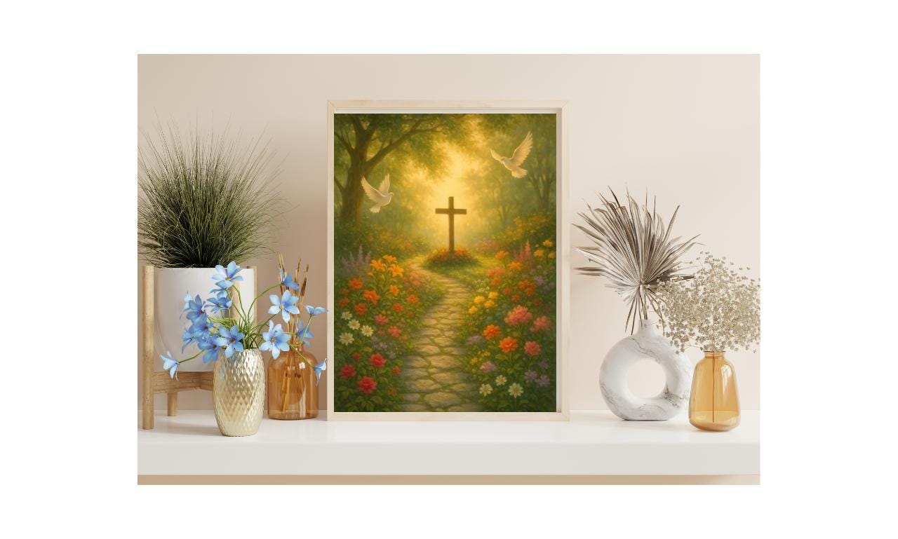 Transform your living space with the tranquil beauty of our "Path to the Cross" Christian wall art. This digital print serves as a daily reminder that walking in faith leads to peace and purpose. Featuring a picturesque pathway illuminated by blooming flowers, two graceful white doves, and a radiant cross at its heart, this artwork exudes warmth and spiritual encouragement.