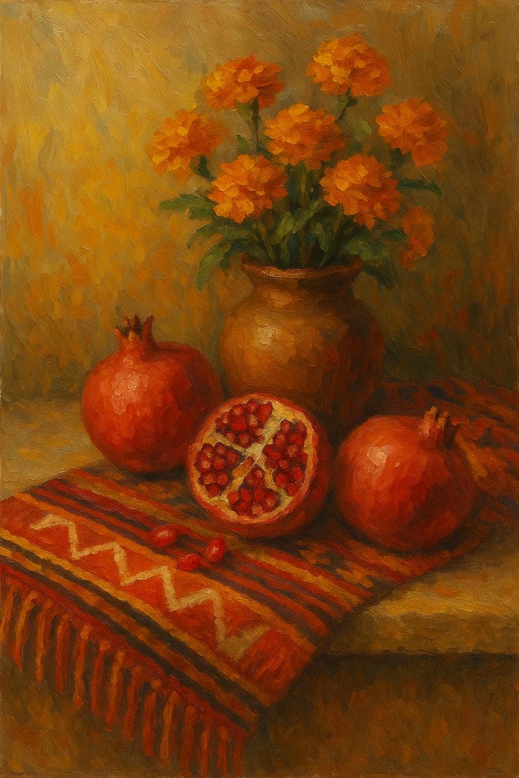Andean Mountain Inspired Still Life Painting with Vibrant Earthy Tones and Rich Textures
