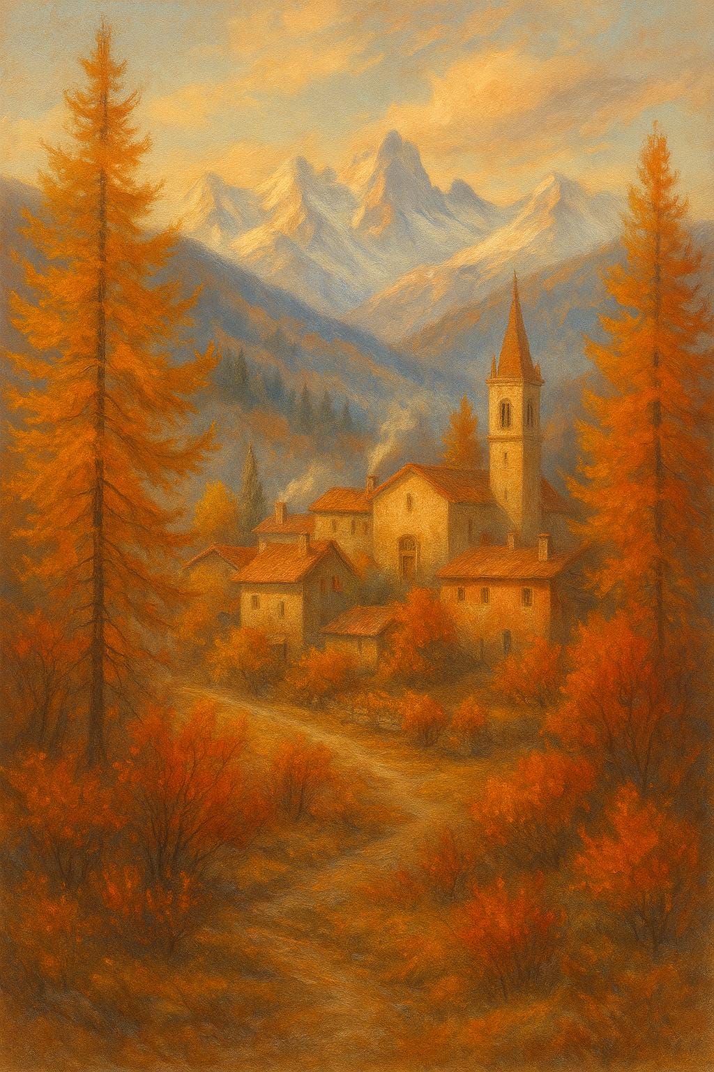 --Charming Scene: Depicts a serene Northern Italian or Alpine village with a traditional church spire, surrounded by tall conifers and rich, autumnal deciduous trees.