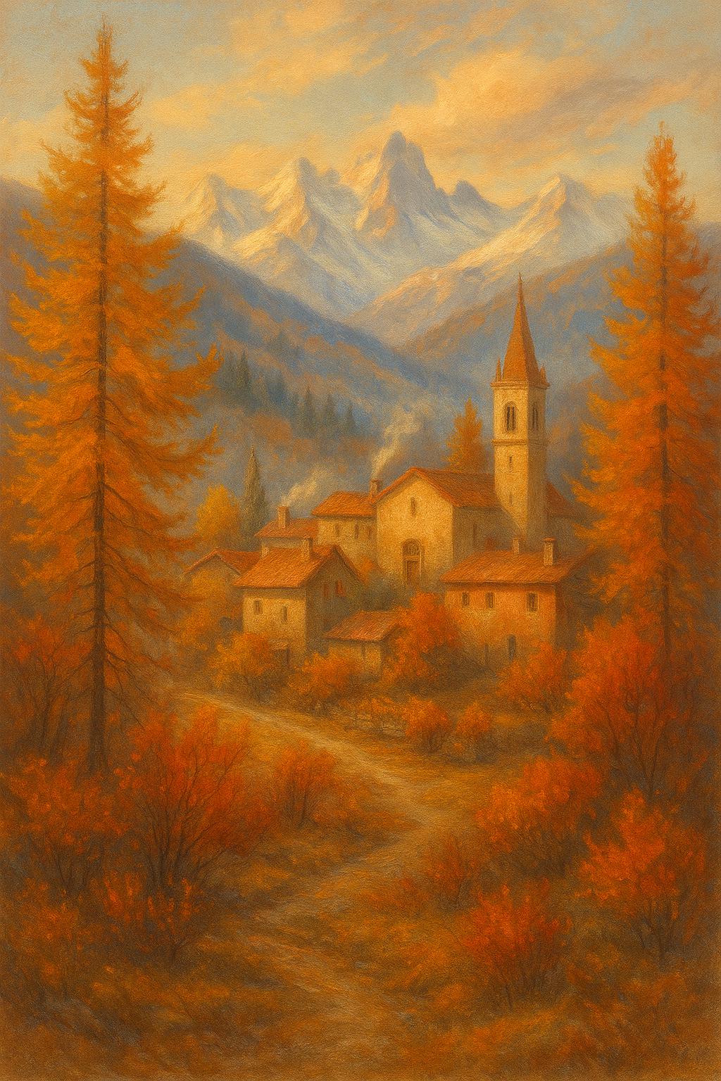 Capture the breathtaking beauty of an Italian autumn with this evocative art print. This piece transports you to a quiet village nestled in the Alpine foothills, featuring the snow-capped mountains of the Dolomites towering over terracotta rooftops and fiery autumn foliage.