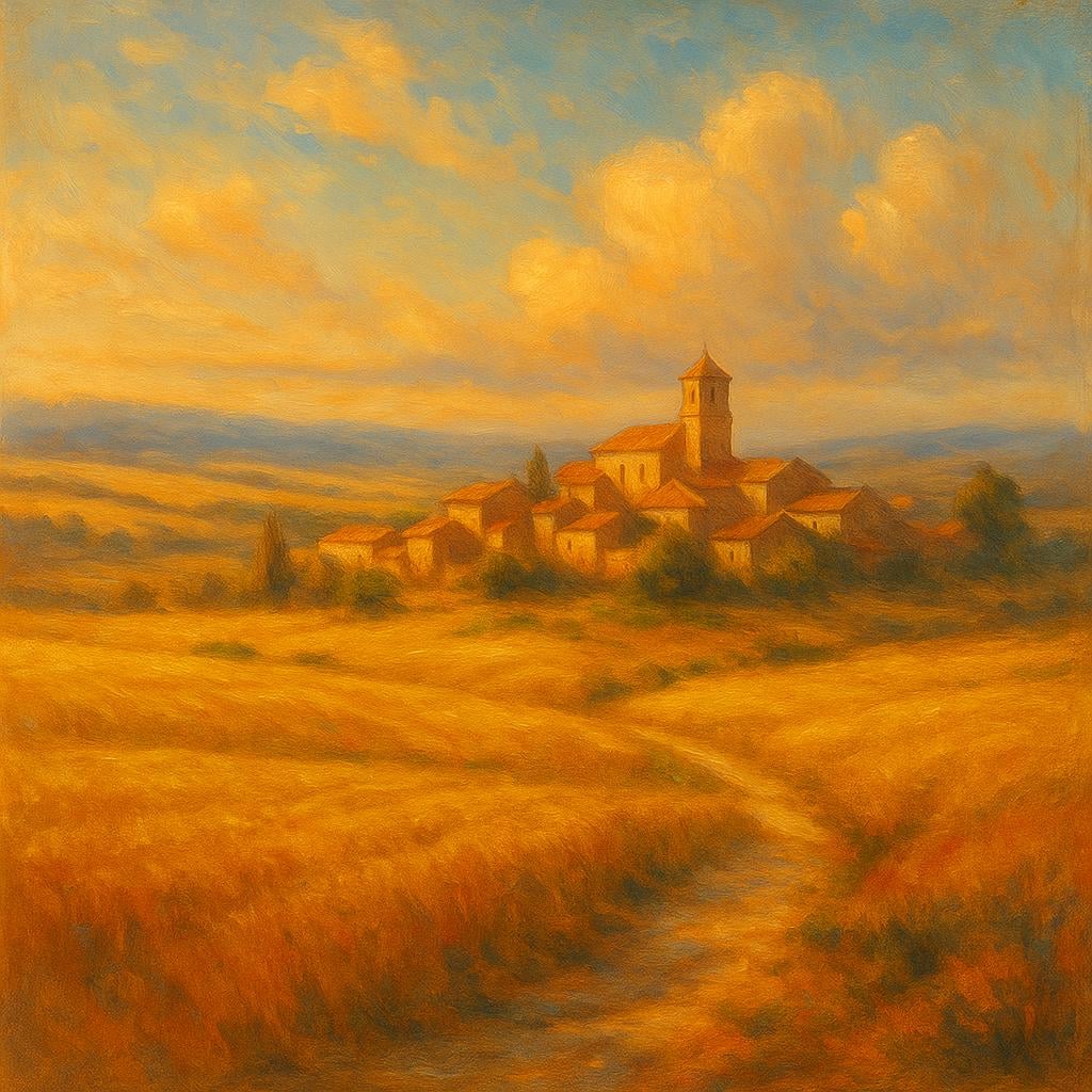 Behold the breathtaking beauty of an old-world landscape, where a charming Spanish or European hilltop village stands majestically amidst expansive fields of sun-kissed gold. This art print captures a moment of glorious light, with dramatic clouds sweeping across a blue sky, echoing the romance and timelessness of classic oil painting.