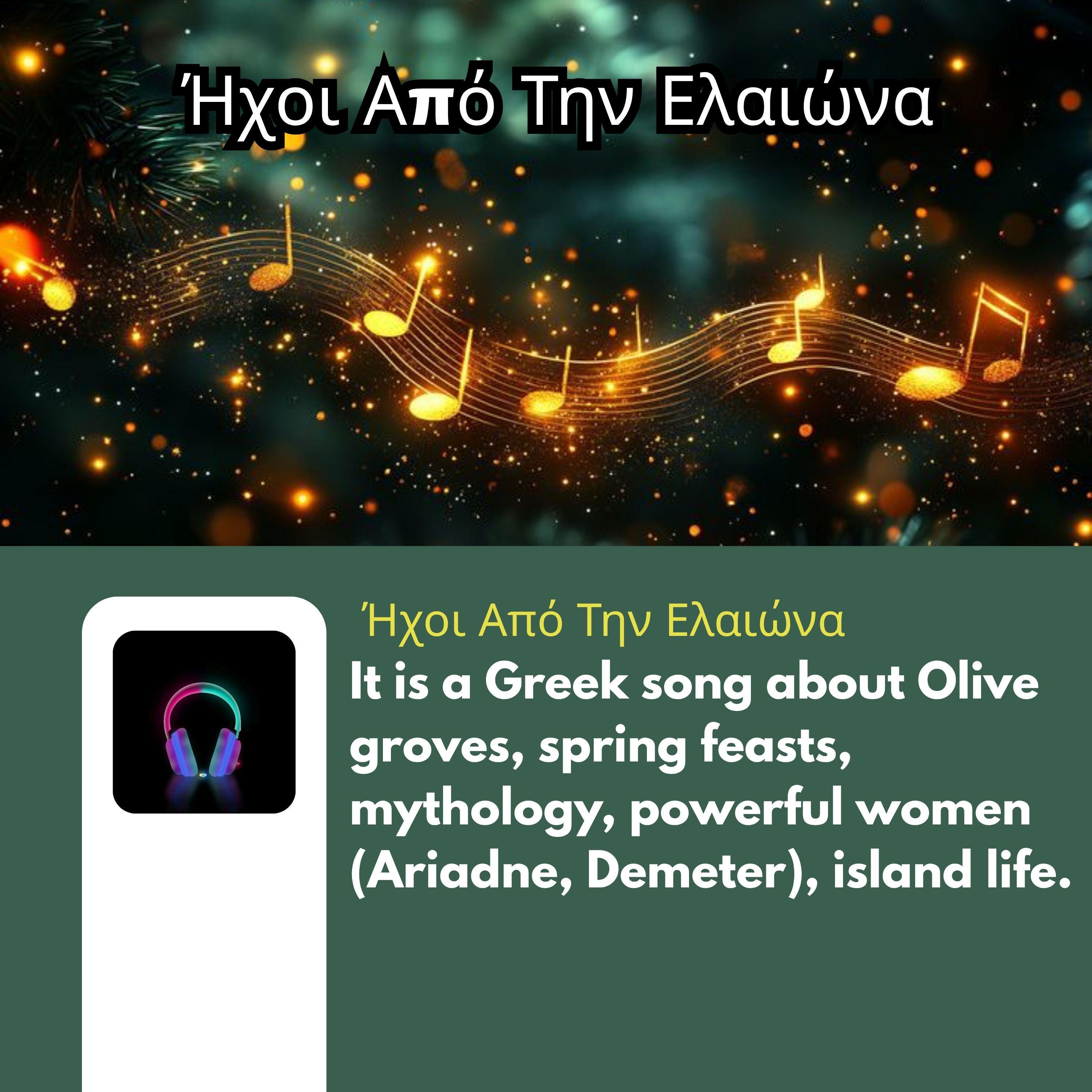 Ήχοι Από Την Ελαιώνα (Sounds from the Olive Grove) is a radiant Greek song that celebrates the spirit of Mediterranean life its olive trees, spring feasts, ancient myths, and powerful women who shaped history and legend. With warm island melodies and lush traditional-inspired instrumentation, the track captures the soul of Greece in full bloom.
